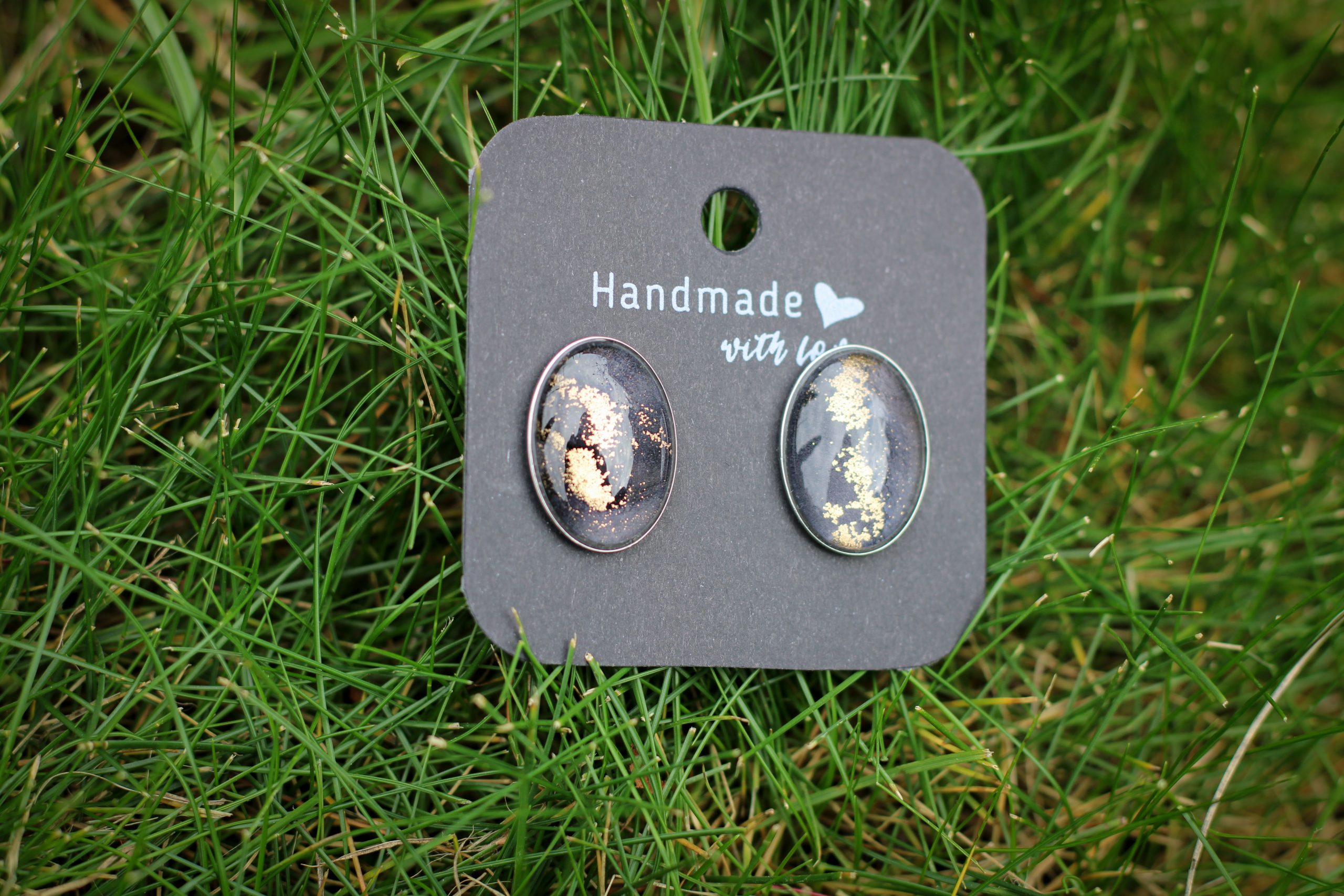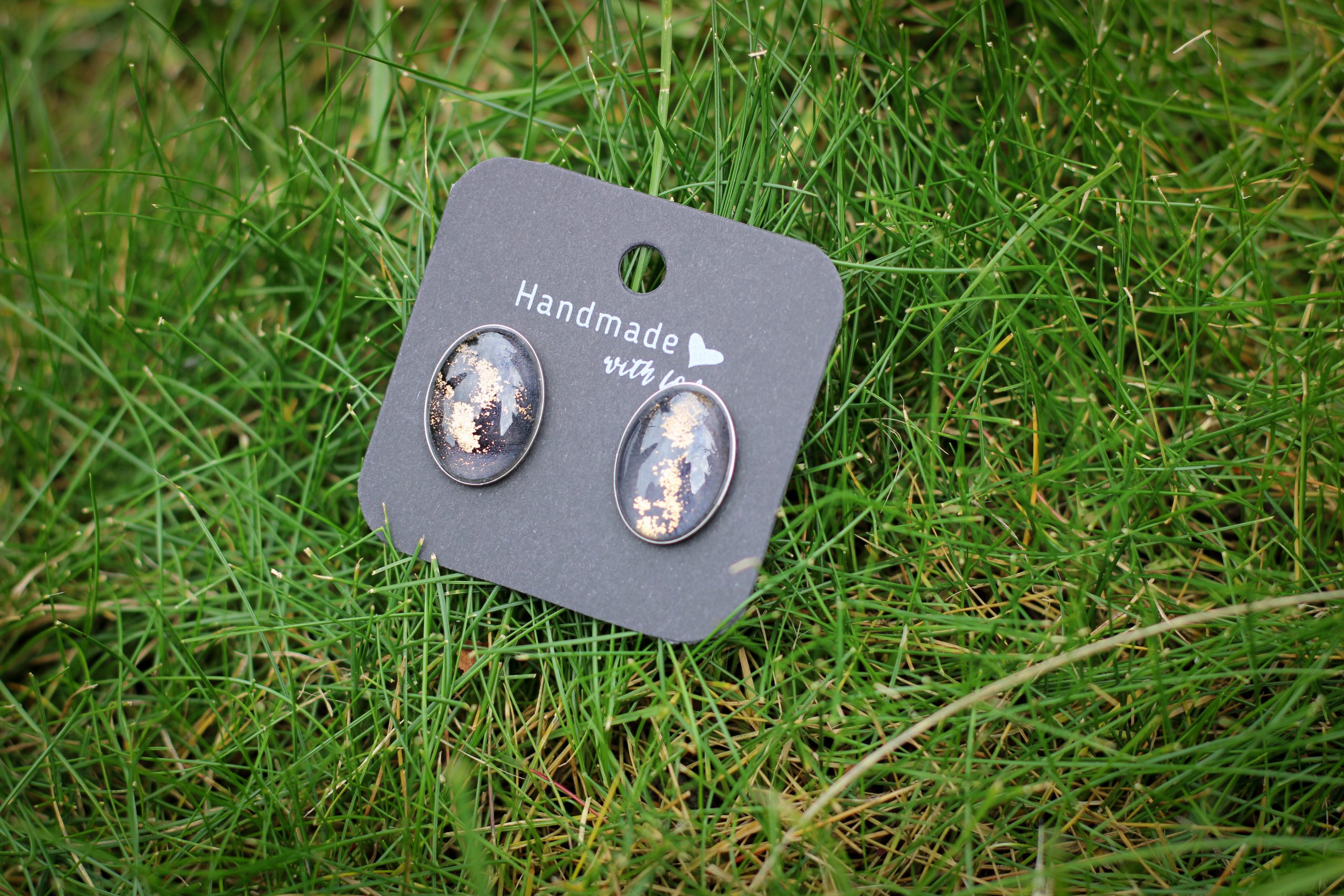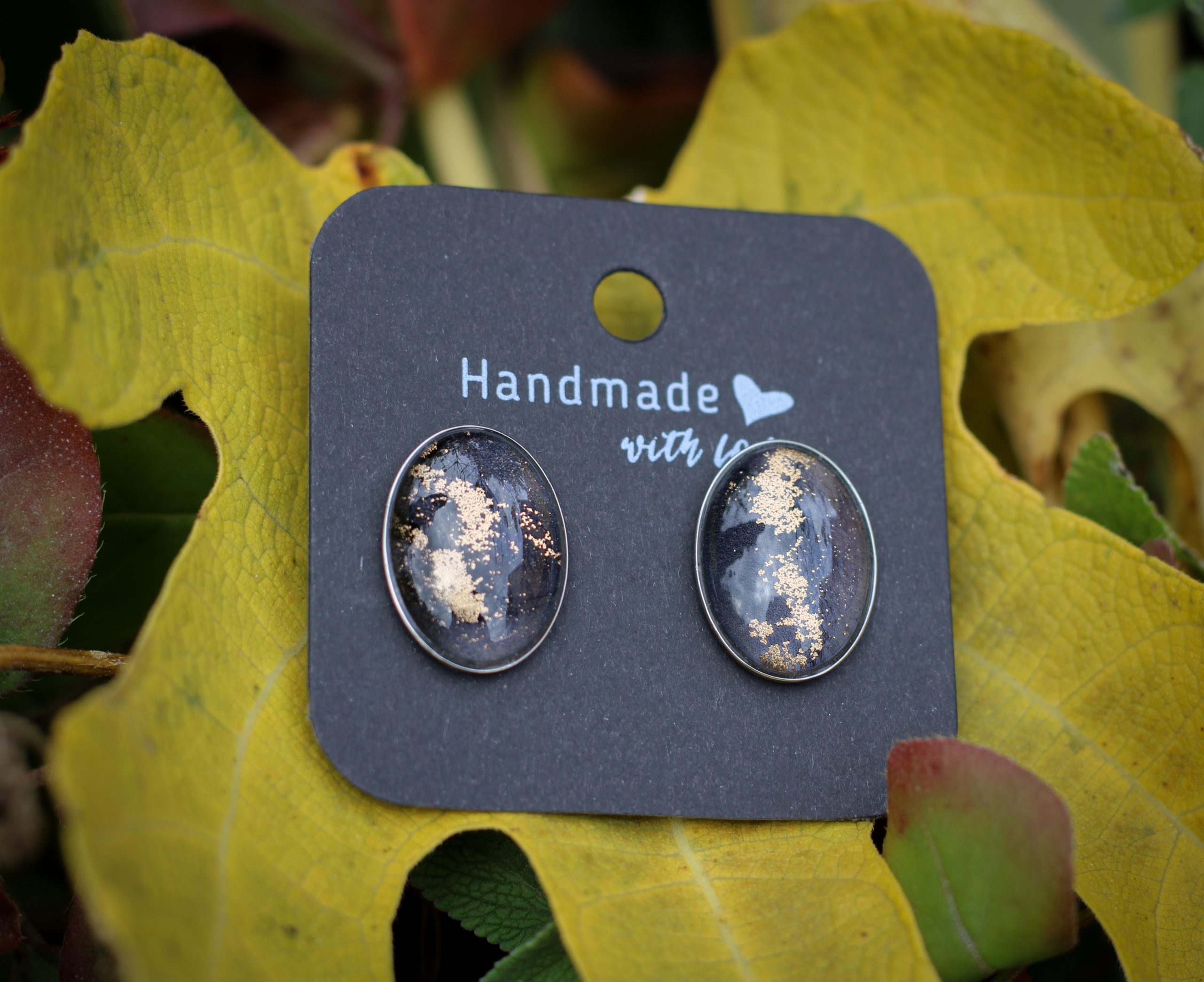 Elegáns fekete és aranyló részletek egyedi nemesacél fülbevalóban.