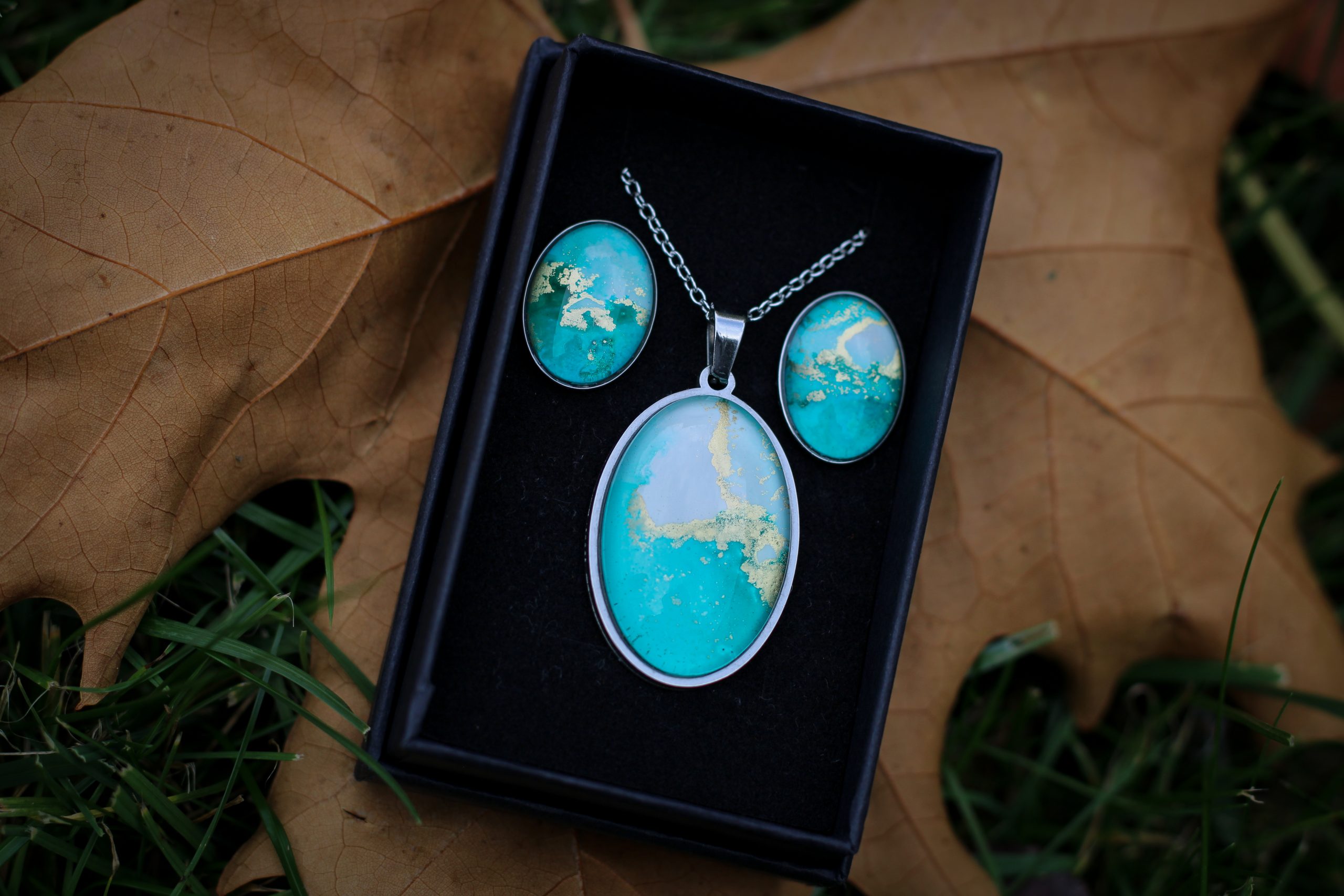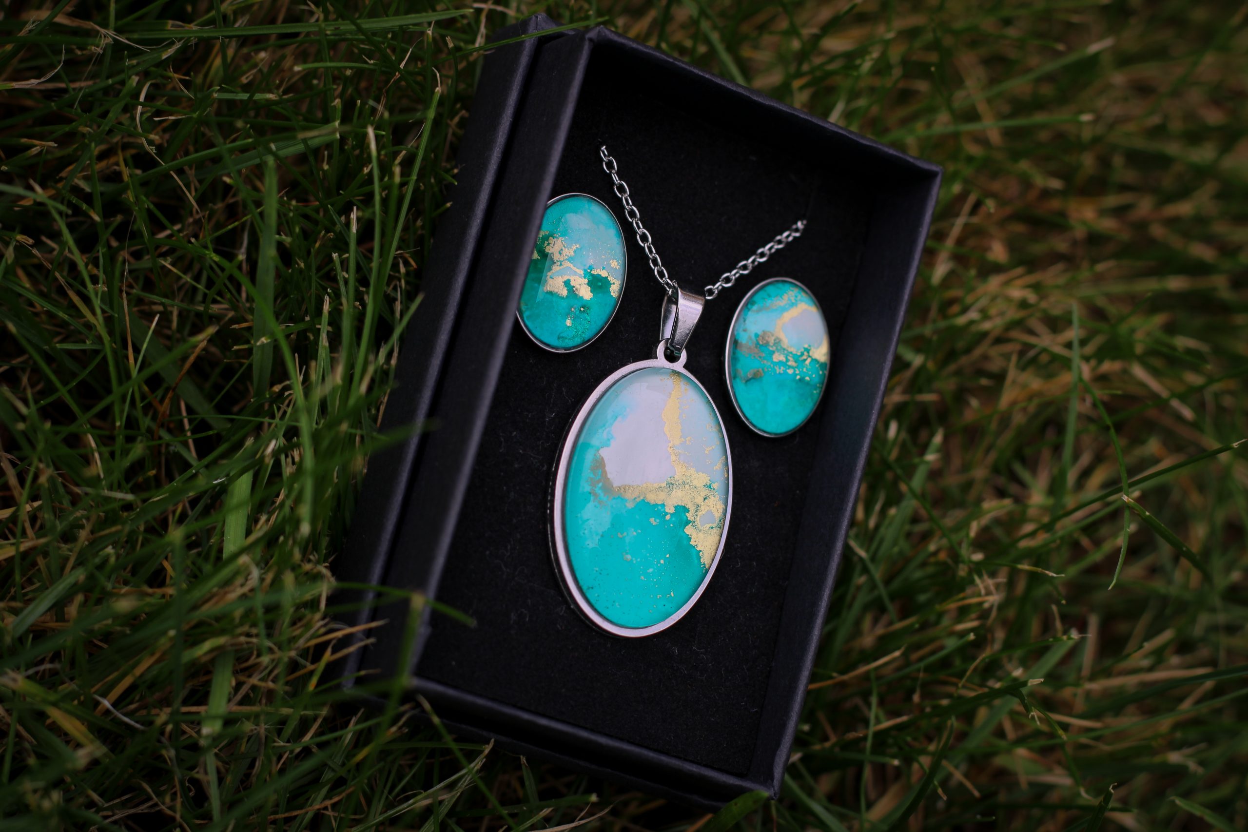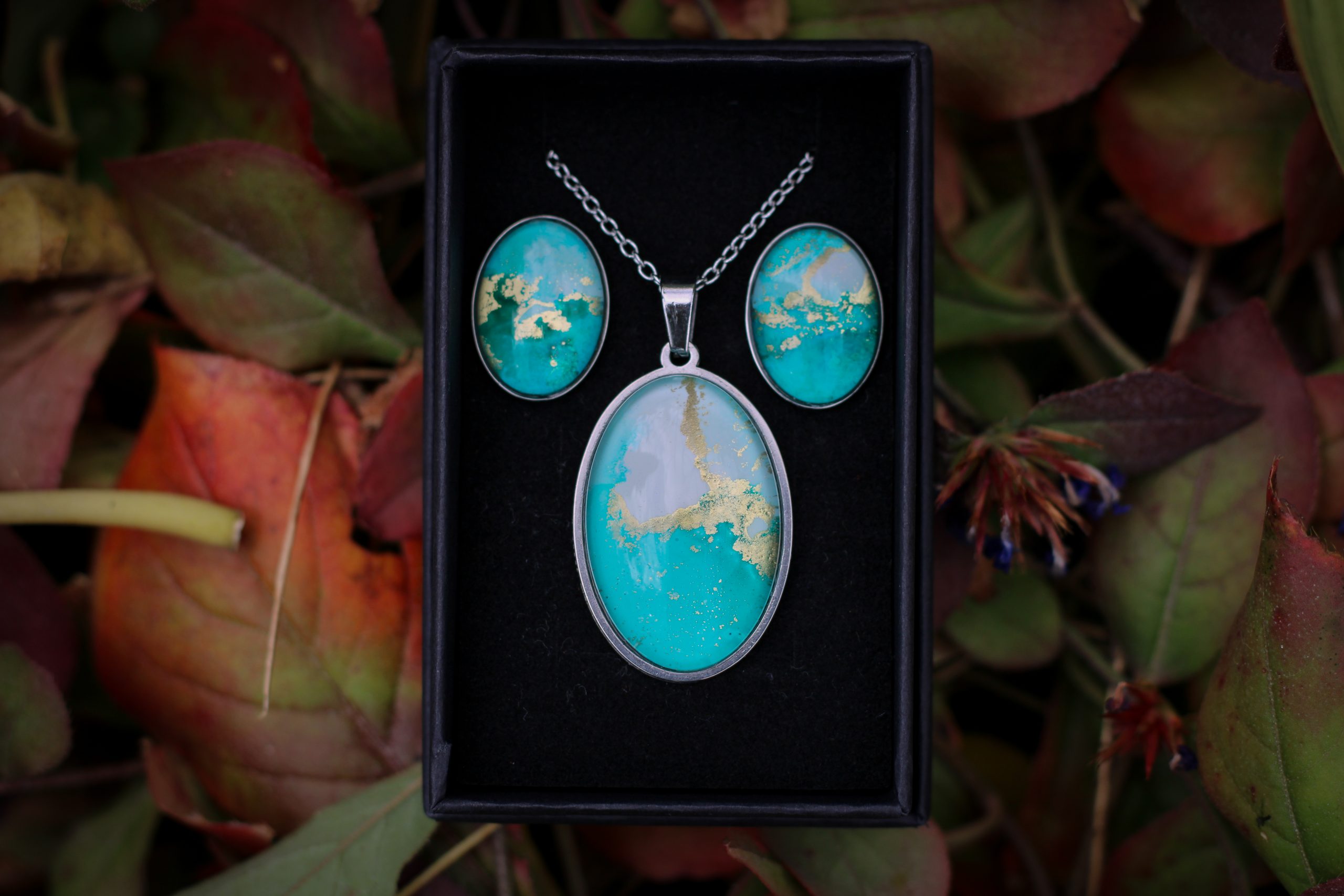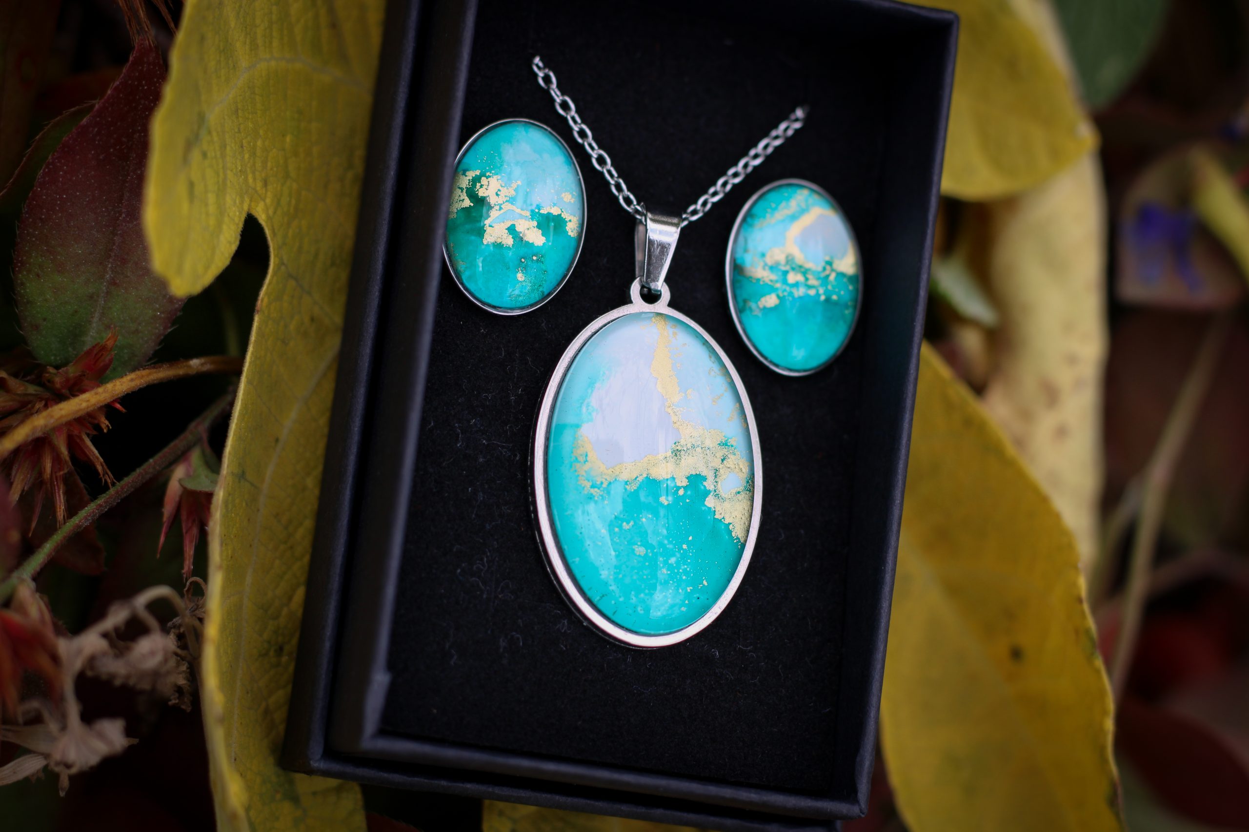A medál és a fülbevalók belsejében saját, eredeti festményem apró részletei találhatók, így minden darab teljesen egyedi és megismételhetetlen.