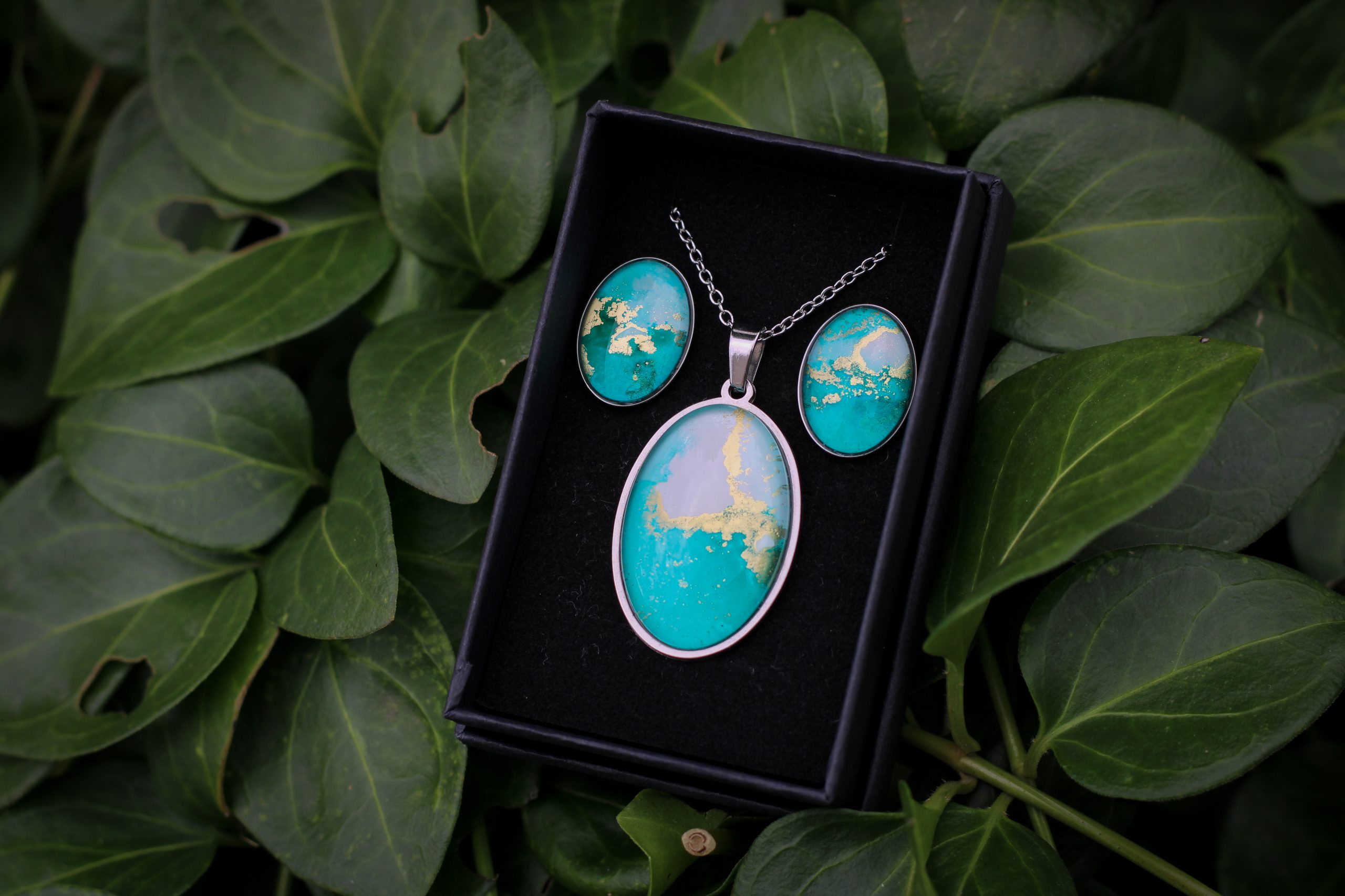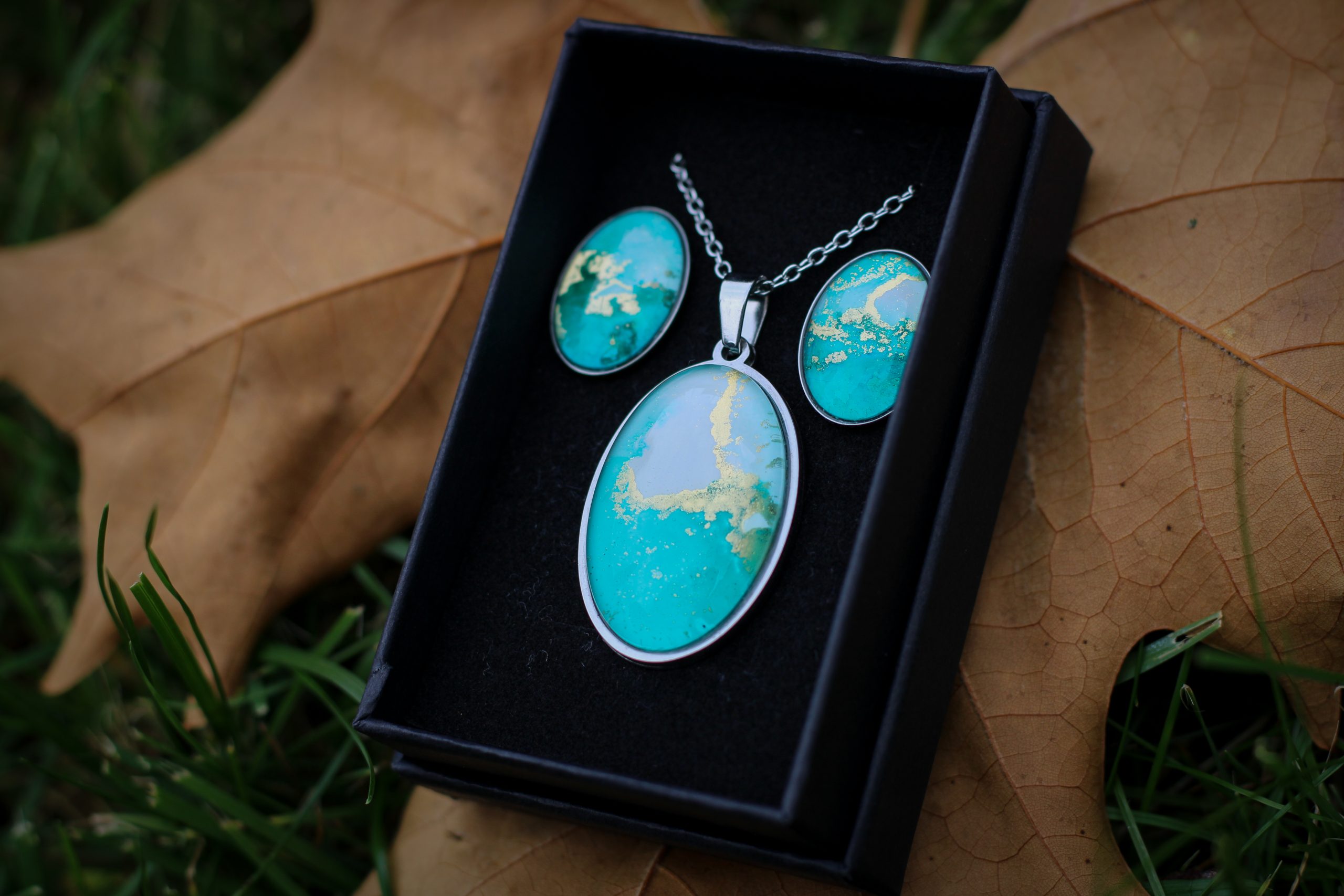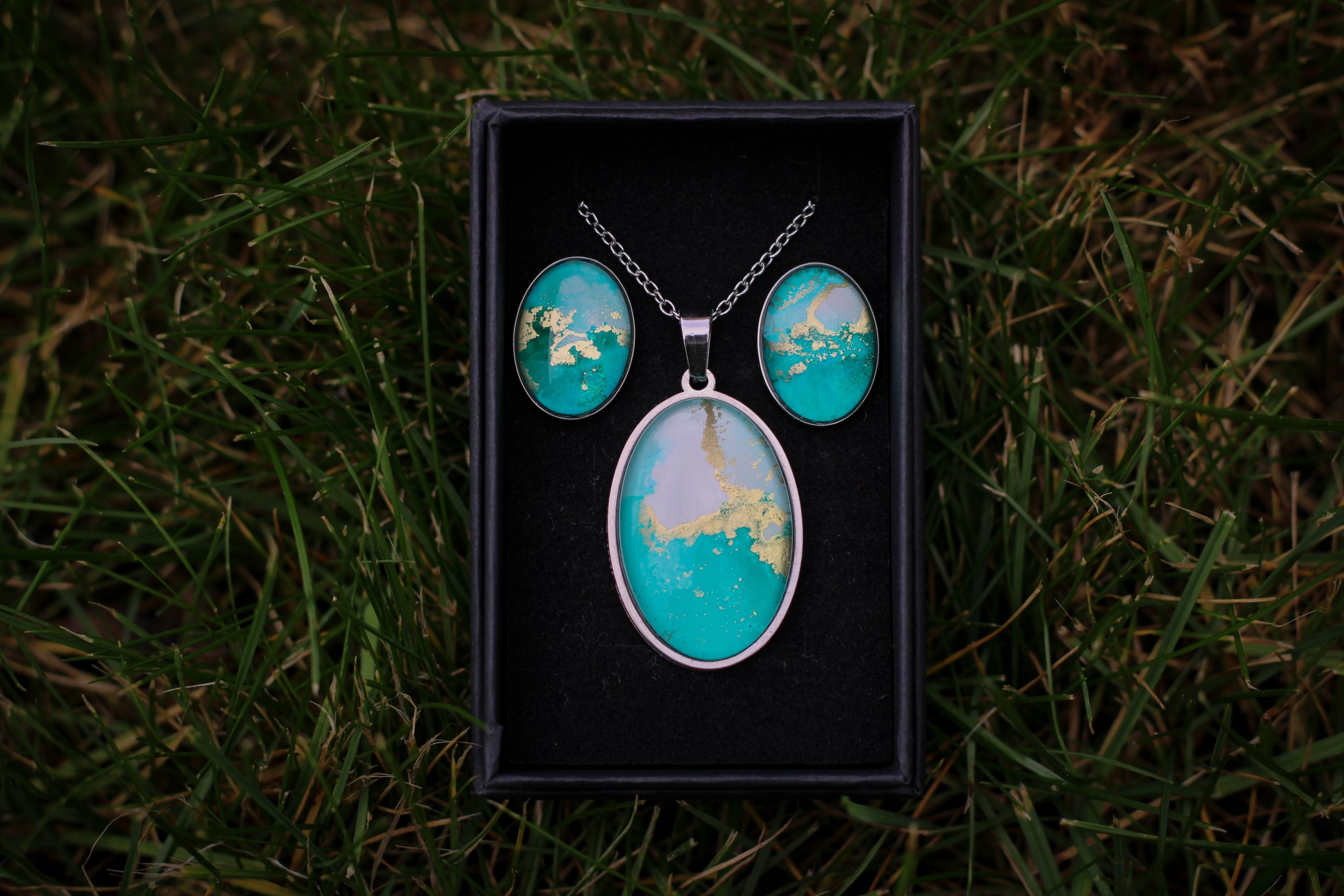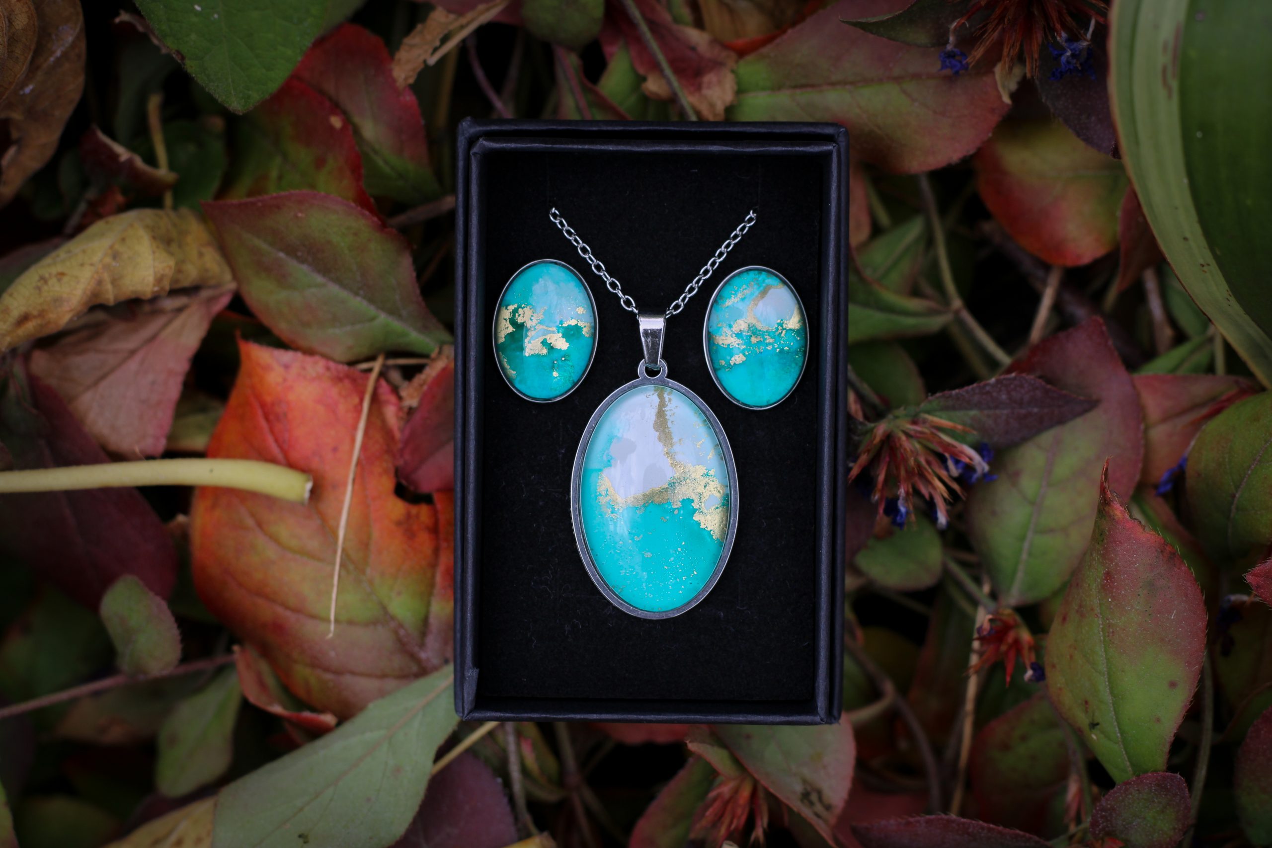 A medál és a fülbevalók belsejében saját, eredeti festményem apró részletei találhatók, így minden darab teljesen egyedi és megismételhetetlen.