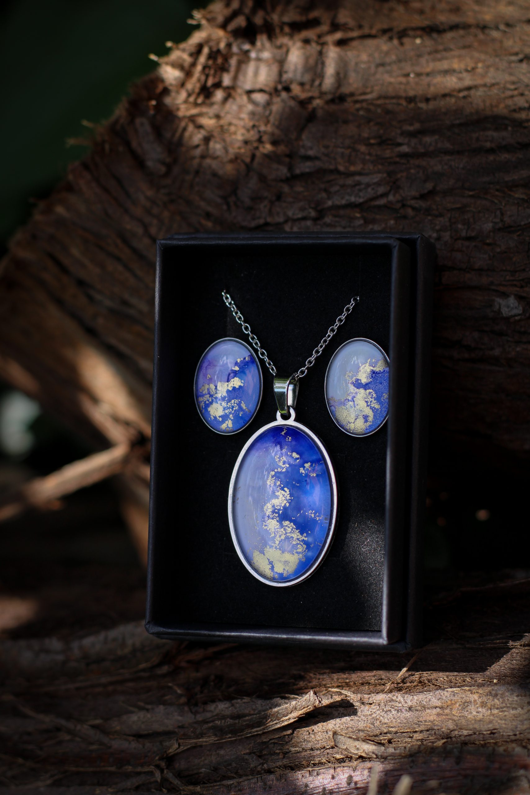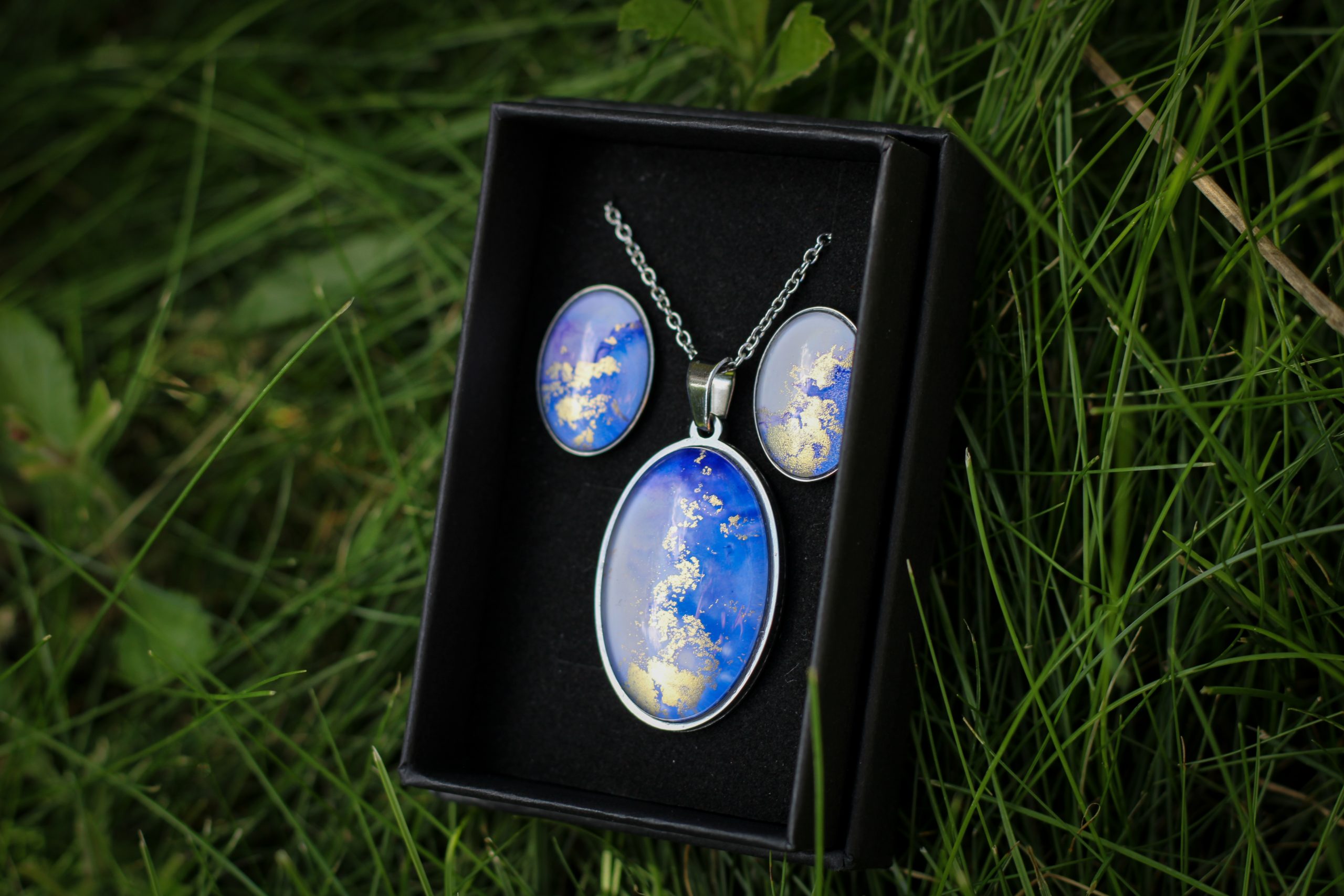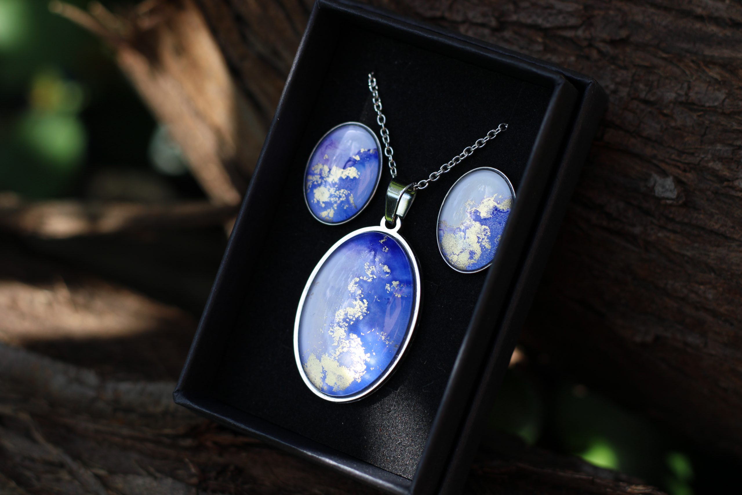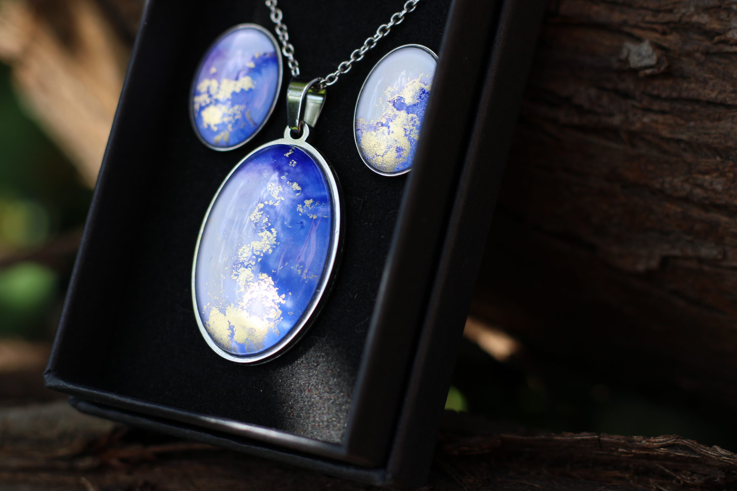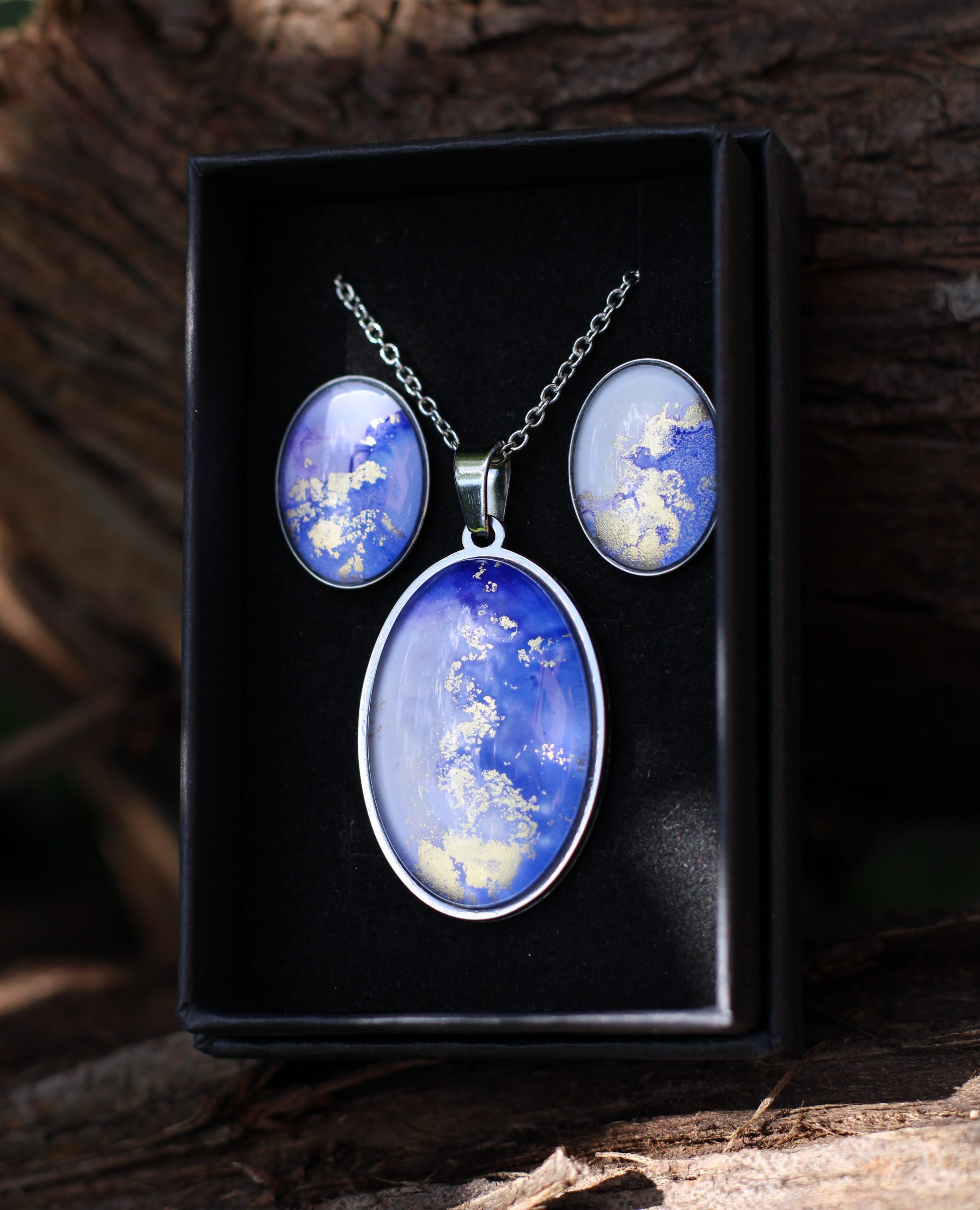 Ez a nemesacél ékszerszett a lágy pasztell lila és levendula árnyalatok finom eleganciáját hordozza, amelyet aranyló részletek emelnek ki különleges fényükkel. A medál és a fülbevalók mindegyikében egyedi, kézzel festett részlet rejlik, így minden darab megismételhetetlen, igazi apró műalkotás. A lila tónusok romantikus, álomszerű hangulatot idéznek, miközben az arany csillanások luxust és kifinomultságot sugároznak.
