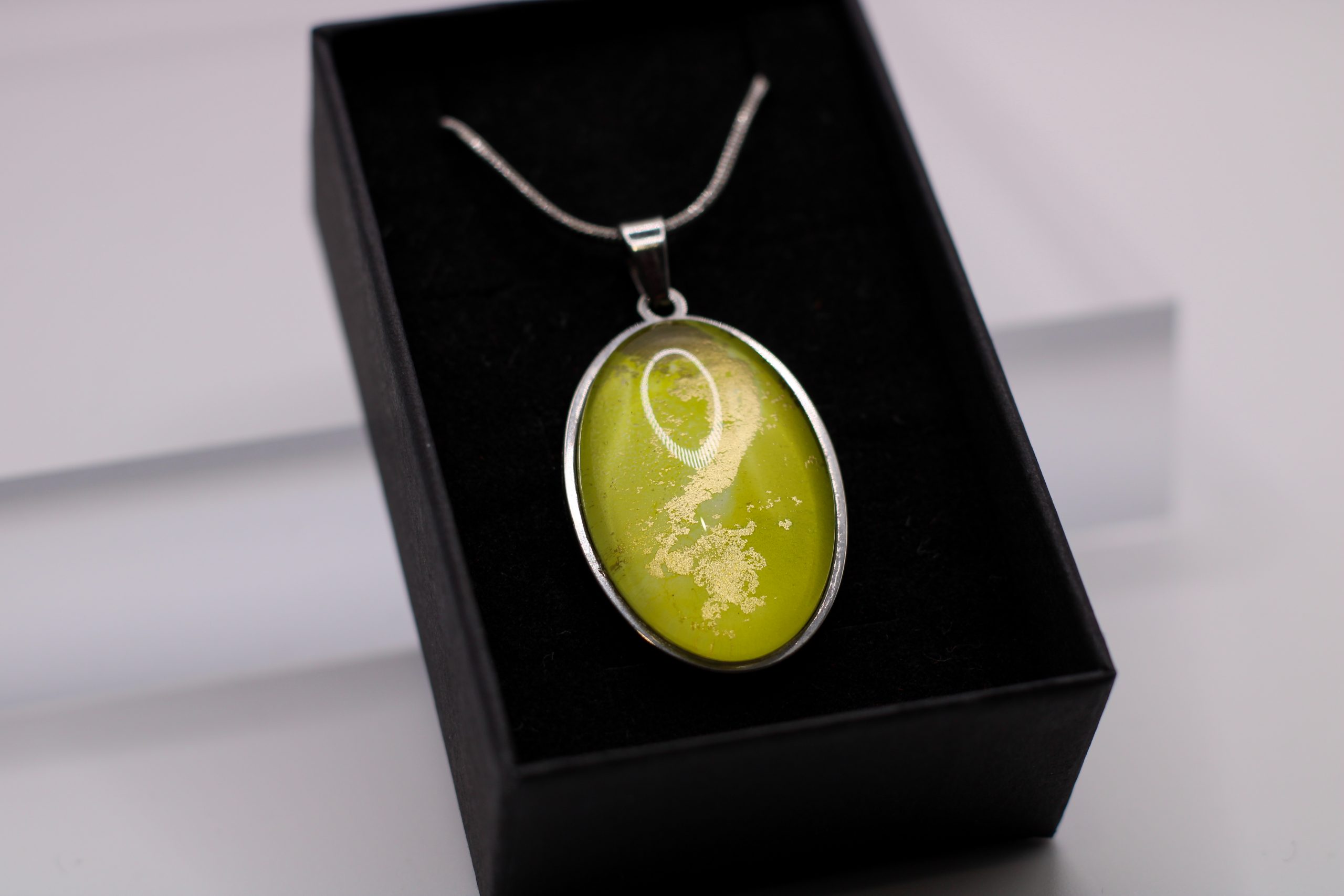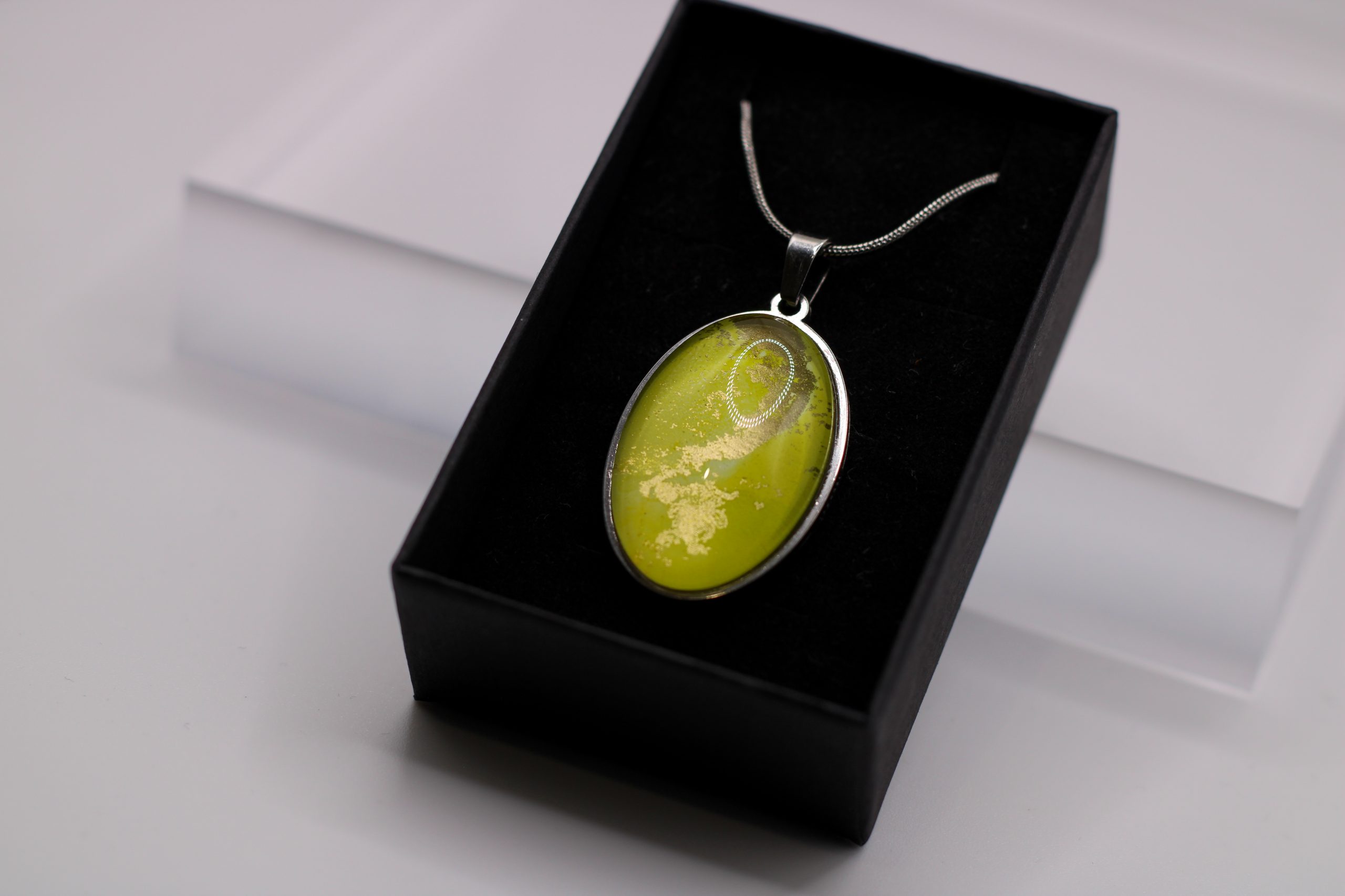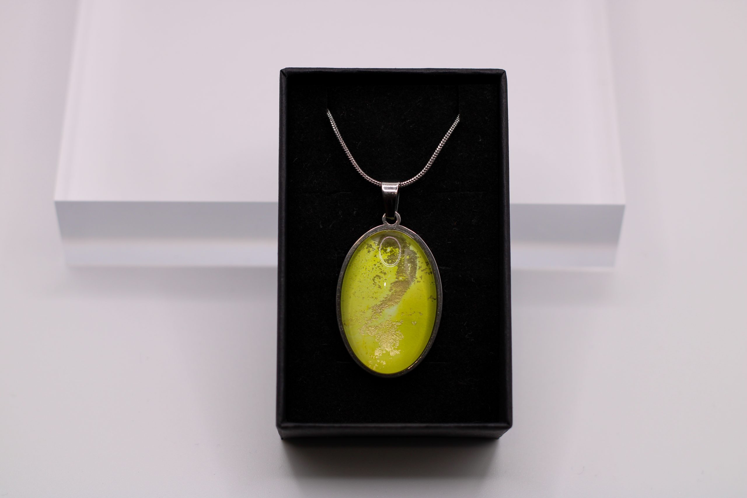 Egyedi, eredeti festményrészletet tartalmazó ovális alakú medál, nemesacél nyaklánccal.