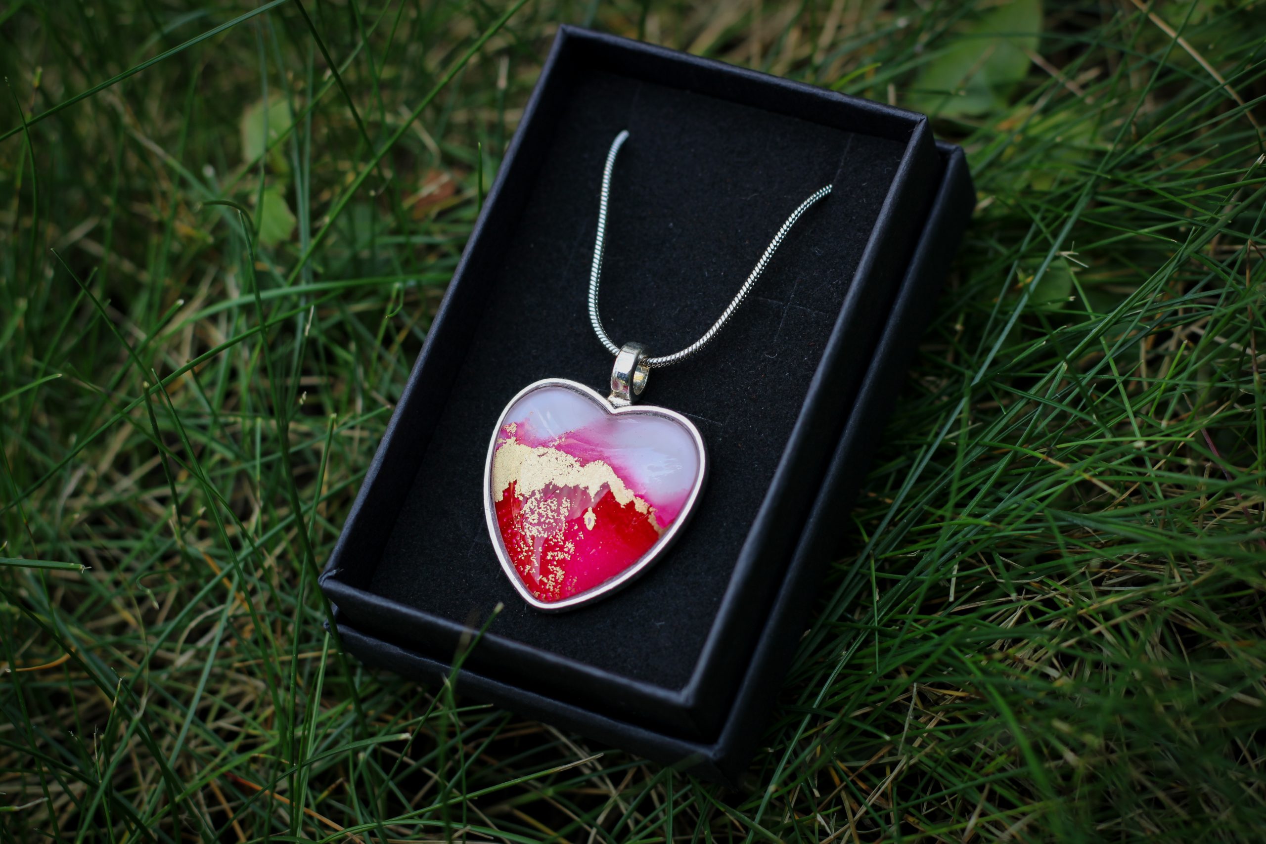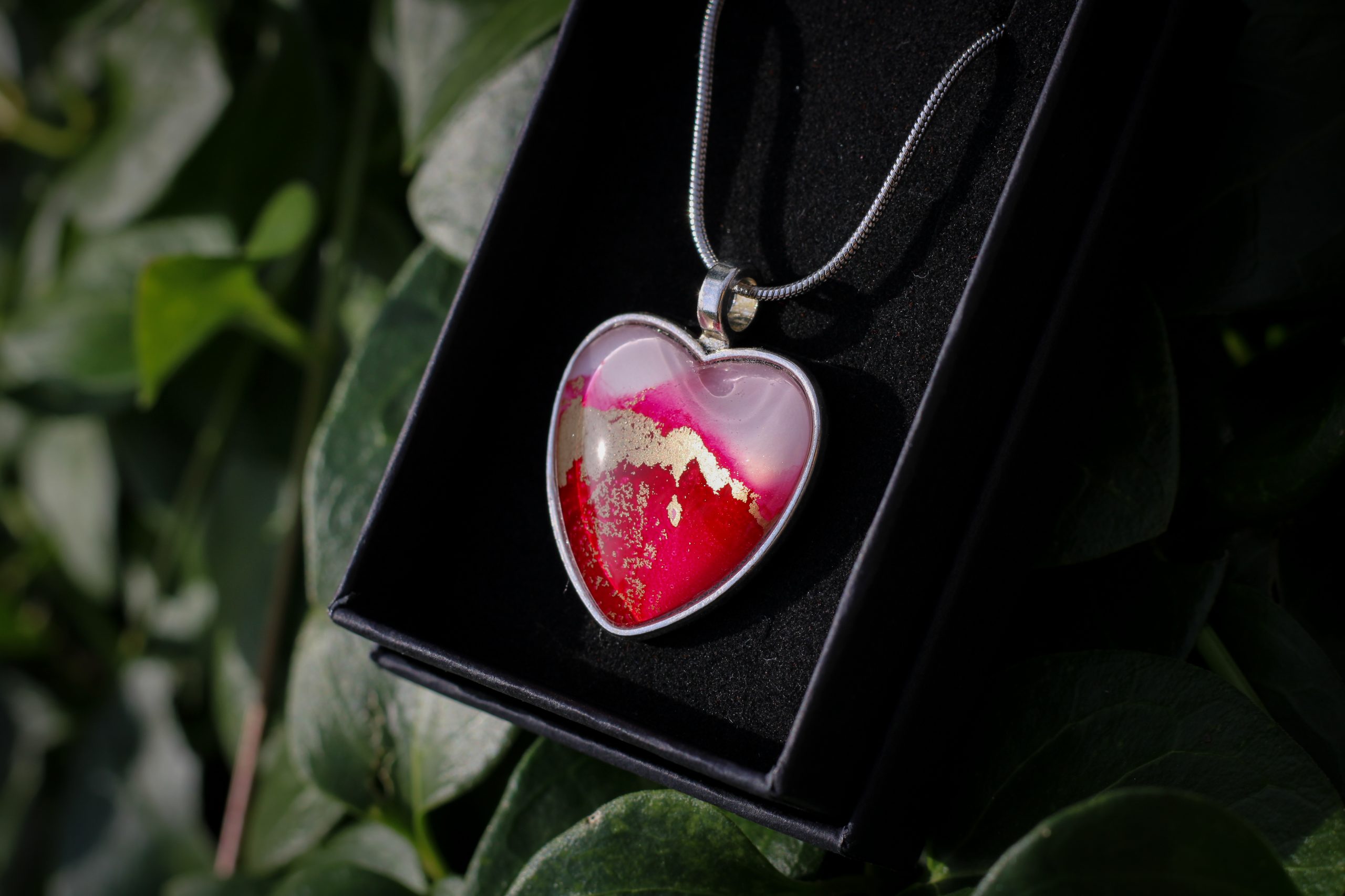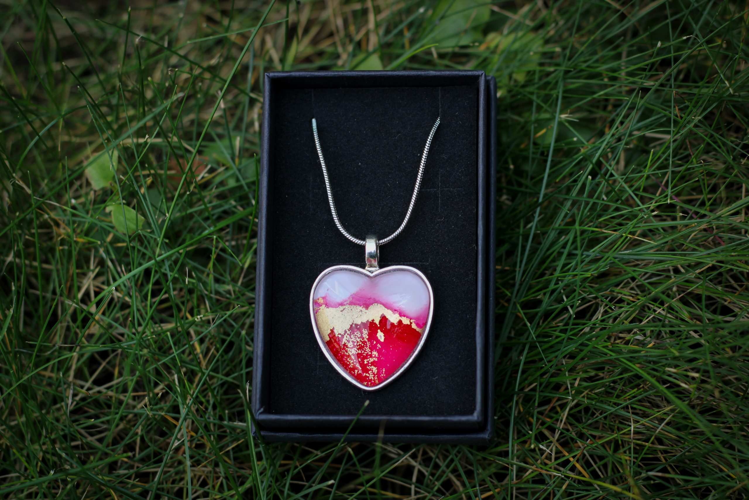 Egyedi, eredeti festményrészletet tartalmazó szív alakú medál, nemesacél nyaklánccal.