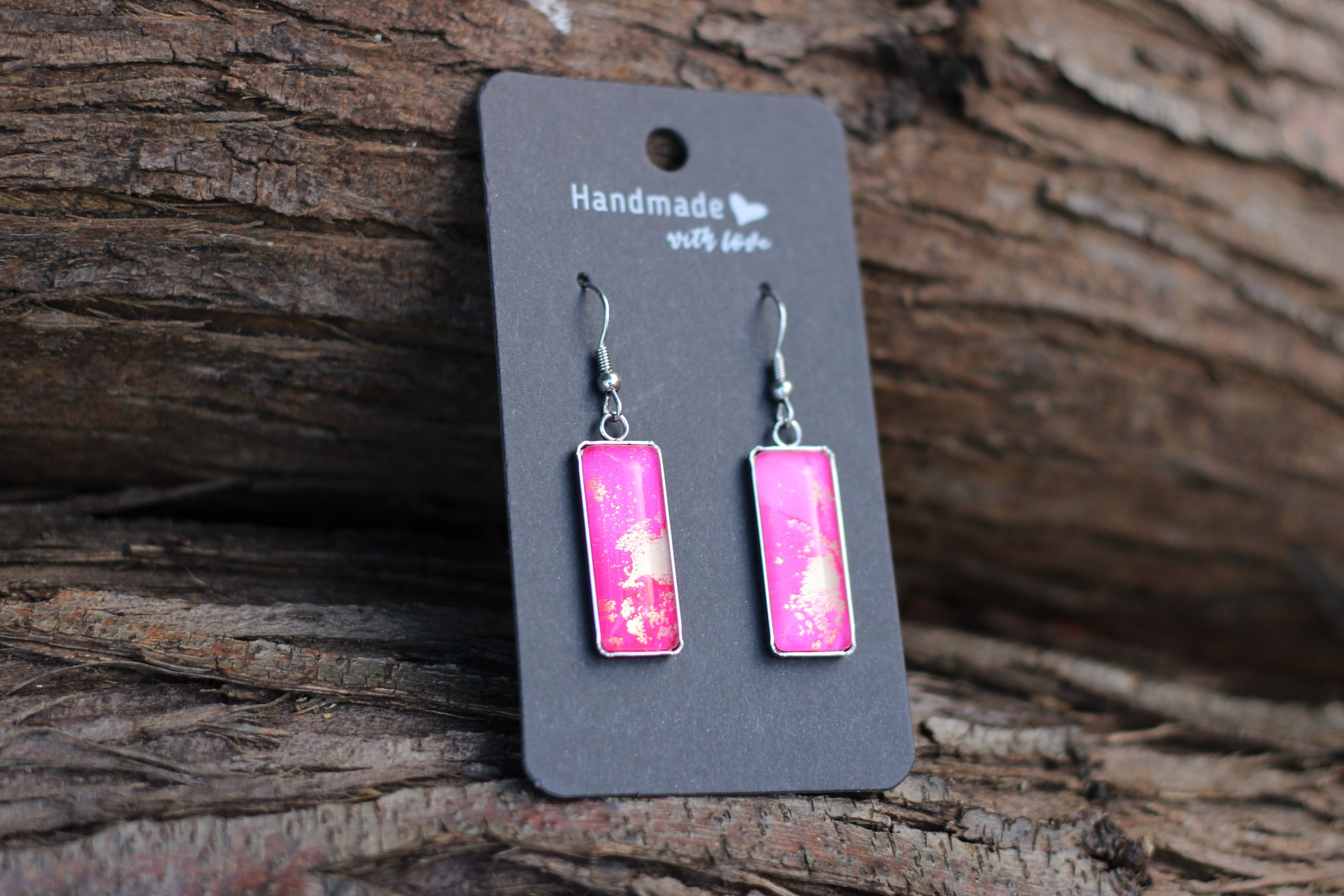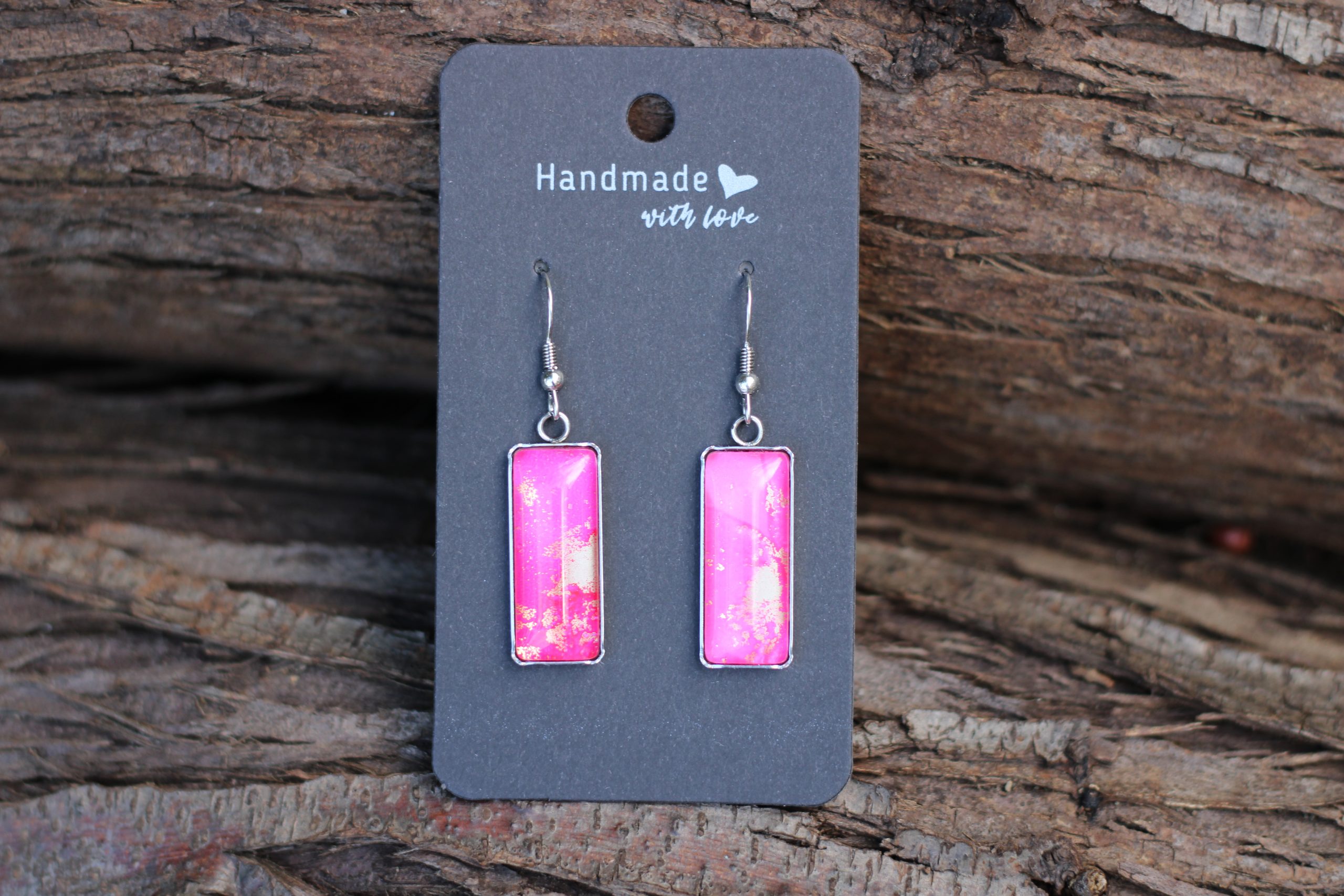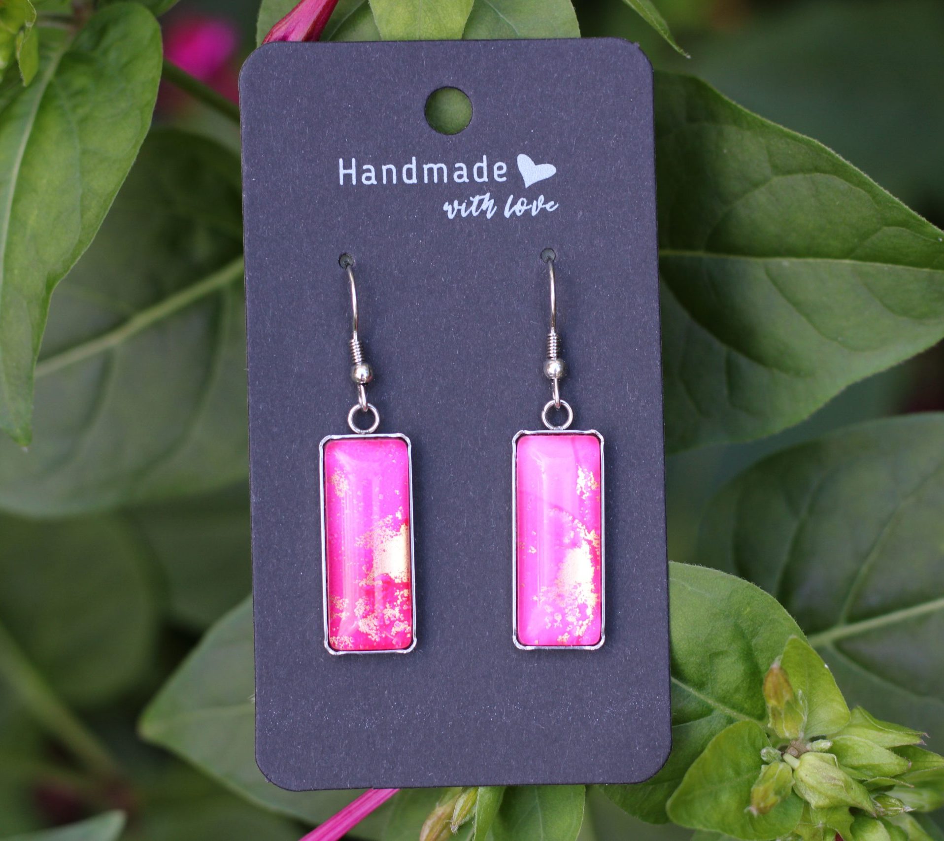 Vibráló pink és aranyló részletek egyedi nemesacél fülbevalóban.