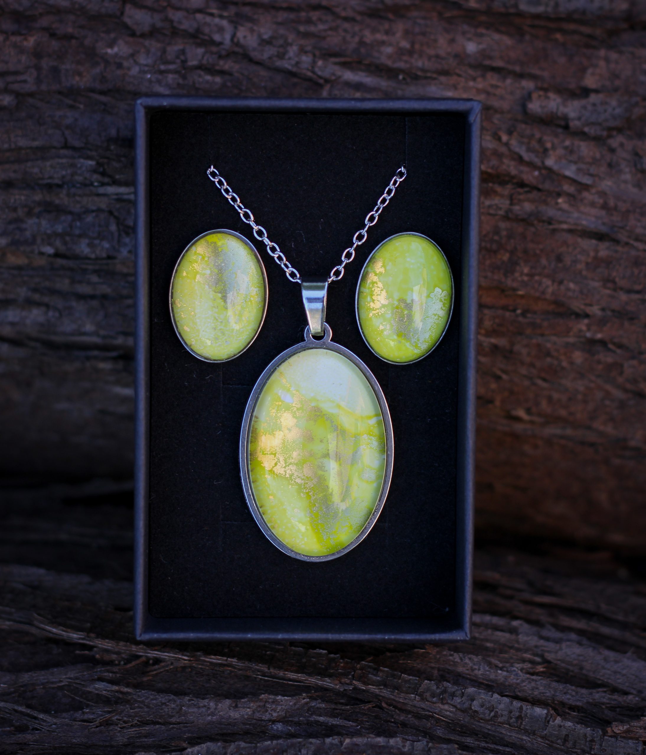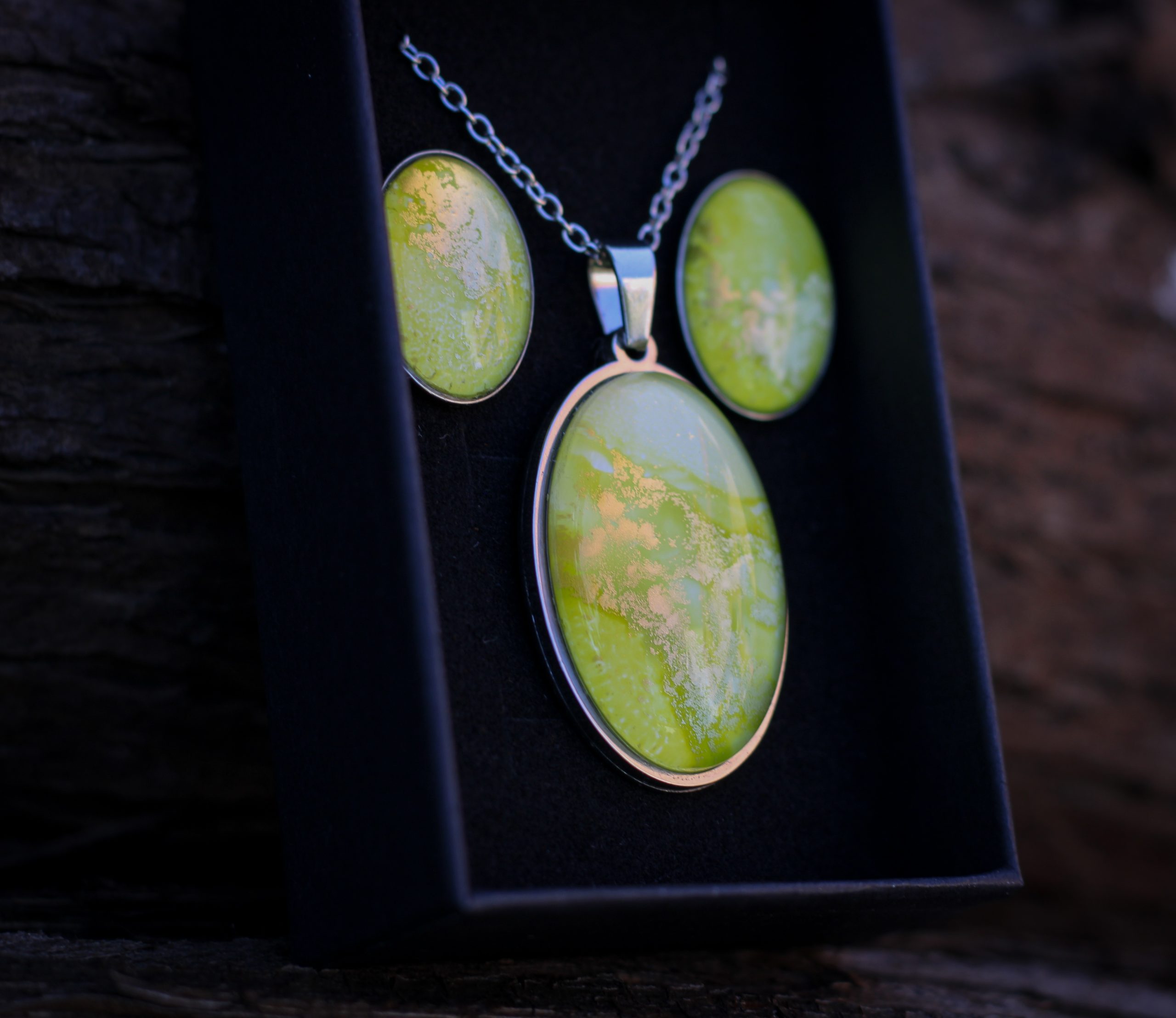 Ez a nemesacél alapra készült ékszerszett igazán egyedi, hiszen minden darabjába saját, eredeti festményem részletét építettem bele.