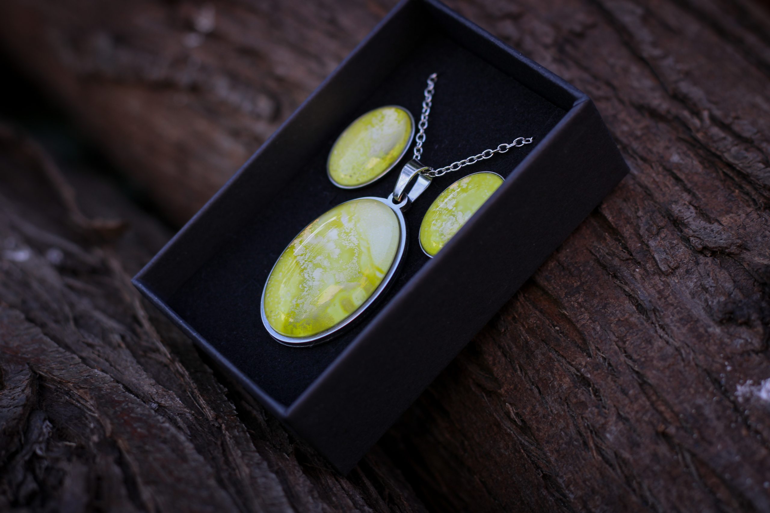 A medál és a fülbevalók élénk, sárgászöld árnyalatai frissességet és energiát sugároznak, miközben a fény játékától sejtelmes aranyló reflexek bontakoznak ki.