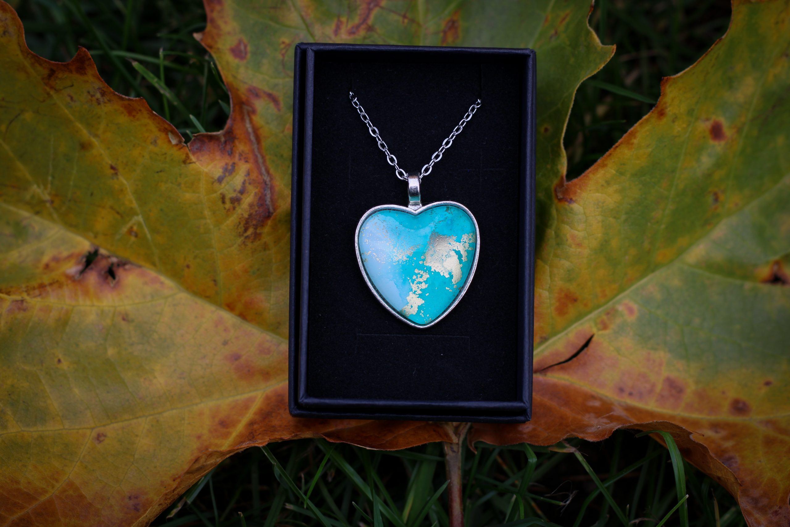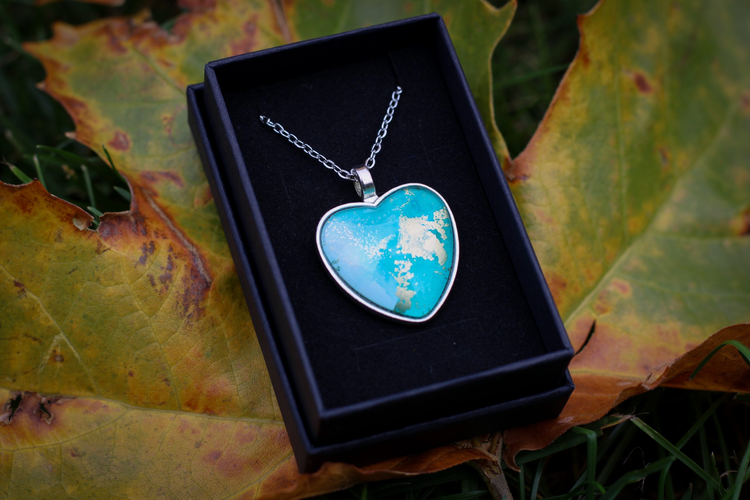 A fémötvözet medálba eredeti festményem egy darabja került beépítésre, a nyaklánc anyaga nemesacél mely 50cm hosszú.