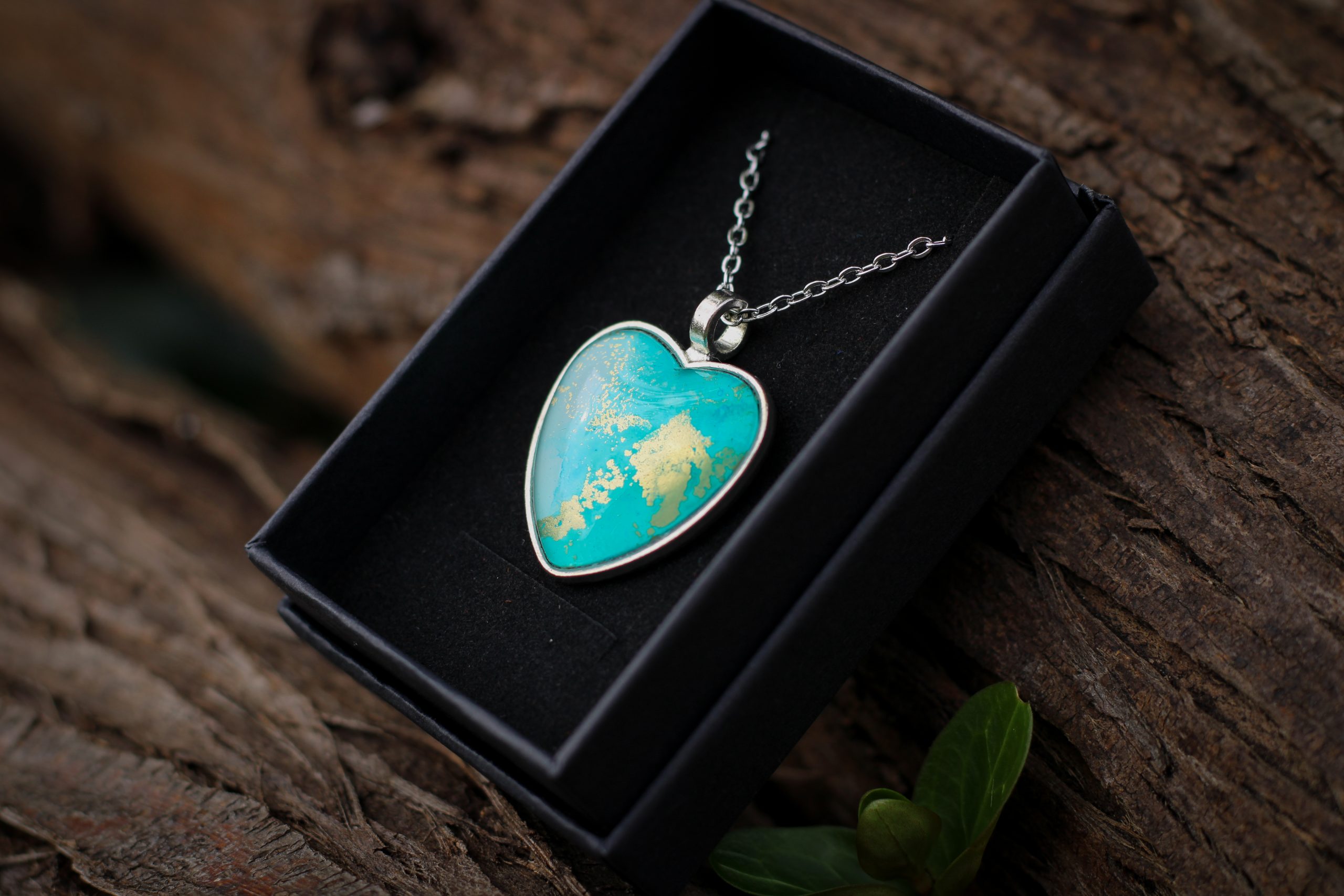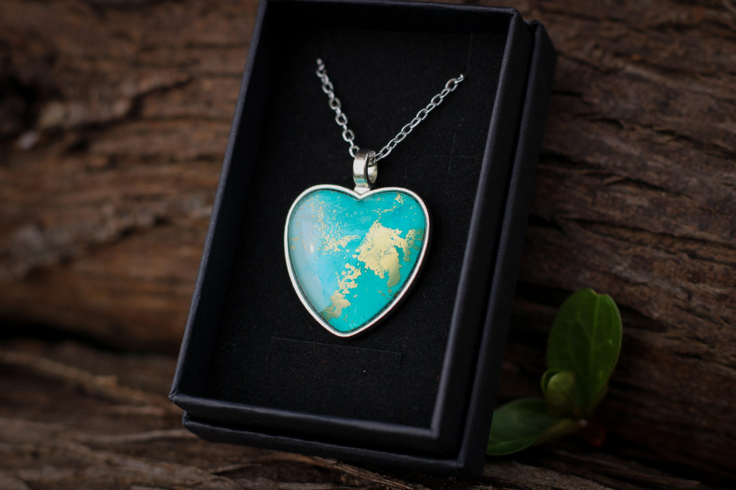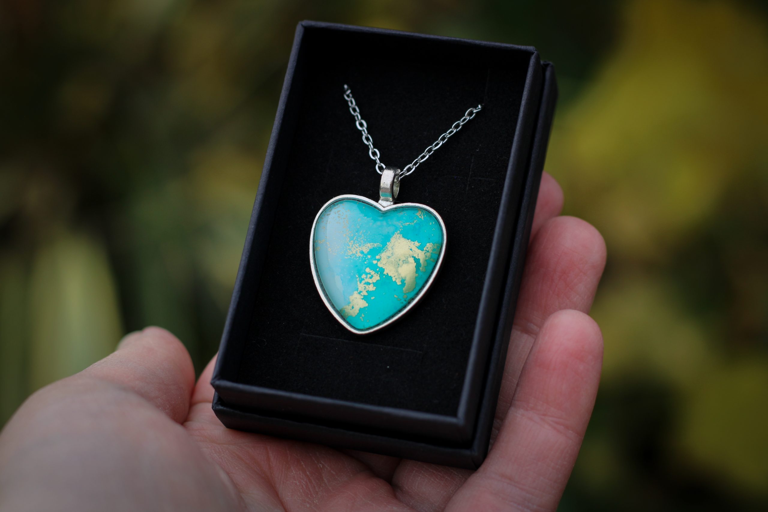 A medál türkizkék árnyalata az óceán frissességét idézi, míg a finoman szétterülő aranyfoltok napfényként csillannak meg a felszínen.